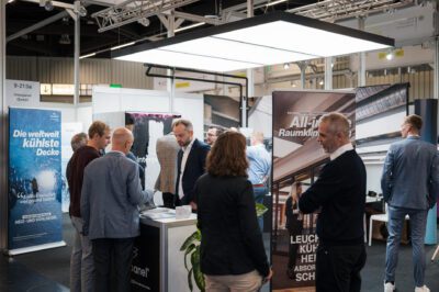 Besucher am Messestand erlebten die akustisch wirksame Klimaleuchte und das Klimapanel im laufenden Kühlbetrieb. Die taupunktunabhängige Kühldecke mit der luftlosen Temperierung durch Absorption von Wärmestrahlung wurde dadurch live spürbar – direkt am Messestand.
